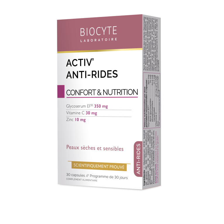 Activ’Anti-Rides de BIOCYTE est un complément alimentaire sans gluten et sans Dioxyde de Titane sous forme de capsules, à base de glycosérum EF qui est un complexe contenant des glycolipides, phospholipides et céramides (molécules structurelles de l’épiderme), associé à du zinc et de la vitamine C qui aident à protéger les cellules contre le stress oxydatif. La vitamine C quant à elle à aussi pour fonction de participer à la formation normale de collagène pour assurer la fonction normale de la peau.
