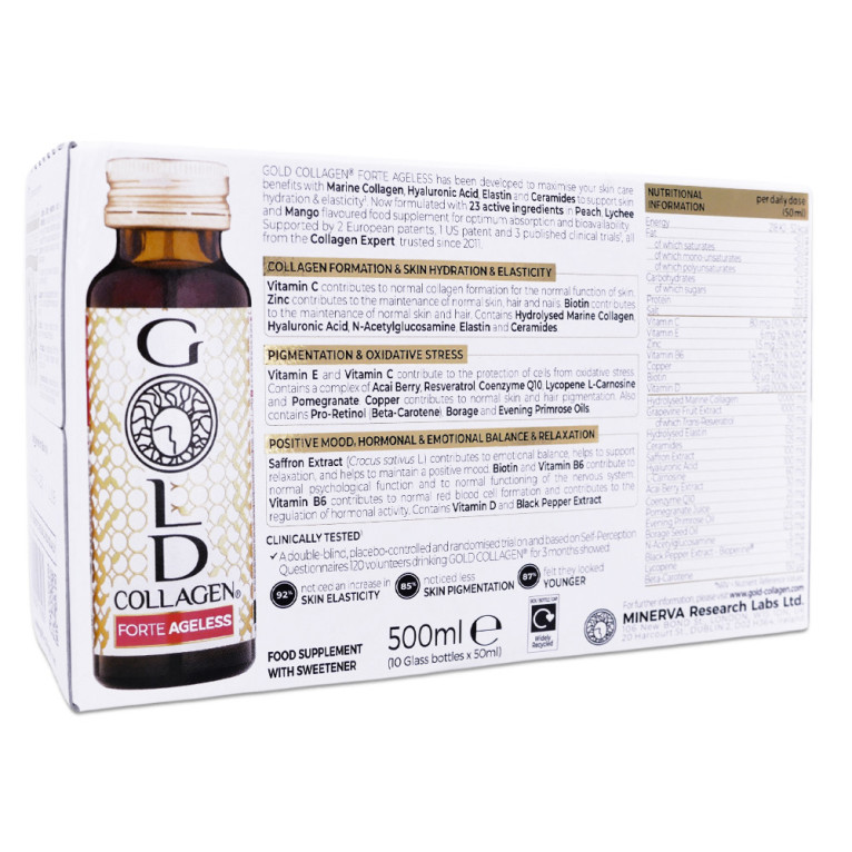Ce complément alimentaire est conçu par le laboratoire MINERVA, reconnu pour son expertise dans le domaine de la nutrition et du bien-être.GOLD COLLAGEN FORTE AGELESS contient 23 ingrédients soigneusement sélectionnés, dont du collagène marin hydrolysé, de l'acide hyaluronique, de l'élastine et des céramides.