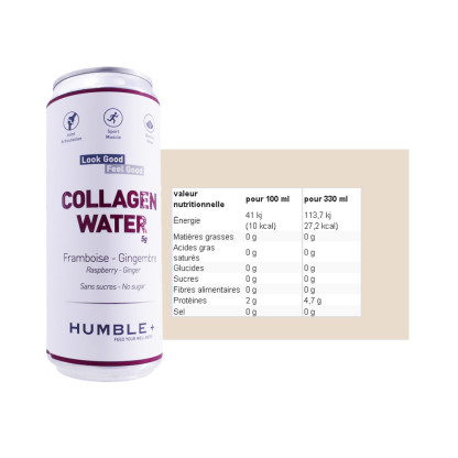Découvrez cette délicieuse boisson pétillante à base de collagène, idéale à consommer au quotidien.Issu de la marque HUMBLE, ce collagen water est formulé avec de la framboise et du gingembre pour une saveur fruitée et rafraîchissante.En plus de son goût délicieux, ce produit contient seulement 4 ingrédients, dont du collagène marin Naticol, un ingrédient largement utilisé dans les produits de beauté pour la peau et dans les compléments destinés au confort articulaire. Profitez de ce collagen water au quotidien dans le cadre d’une alimentation variée et équilibrée.N'attendez plus pour l'ajouter à votre panier !