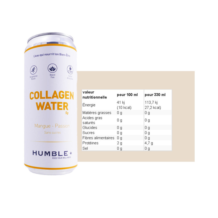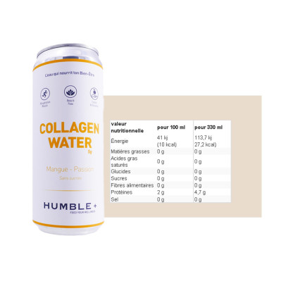HUMBLE + COLLAGEN WATER MANGUE PASSION 330ML est en vente en ligne, boisson pétillante à base de collagène (solution buvable - collagen drink), sur le site de votre parapharmacie à prix discount. Découvrez cette délicieuse boisson pétillante à base de collagène, idéale à consommer au quotidien.