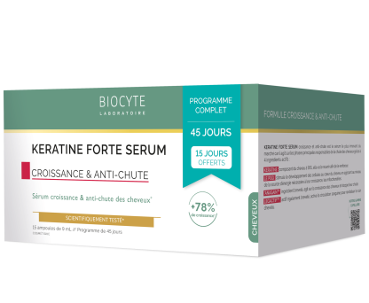 Le sérum Kératine Forte de BIOCYTE, le produit capillaire pour renforcer la chevelure et lutter contre la chute des cheveux.