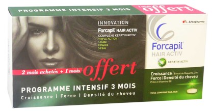 Le complément alimentaire FORCAPIL HAIR ACTIV réunit des vitamines, minéraux, plantes et acides aminés indispensables à la bonne santé du cheveu et du cuir chevelu A base d’un actif le « keratin’activ » qui est un complexe à base de cystine, méthionine et arginine qui sont des acides aminés présents naturellement dans l’organisme, ce complément alimentaire va renforcer la chevelure et redonner de la résistance et de la force aux ongles. La vitamine B8 et le zinc va contribuer à ralentir la chute des cheveux et relancer leur croissance. Le cuivre va avoir la propriété de normaliser la pigmentation du cheveux pour une couleur toujours éclatante. Les extraits de roquette et prêle vont participer à la croissance des cheveux en stimulant le bulbe capillaire et en redonnant force et résistance aux cheveux et aux ongles Son action prolongée garantit un maximum d’efficacité pour maintenir la chevelure en pleine santé et les ongles de toute beauté.