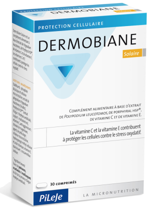DERMOBIANE Solaire du laboratoire PILEJE à prix discount, en vente dans votre parapharmacie en ligne discount, un complément alimentaire conçu à partir de vitamine C et de vitamine E qui contribuent à protéger les cellules contre le stress oxydatif.