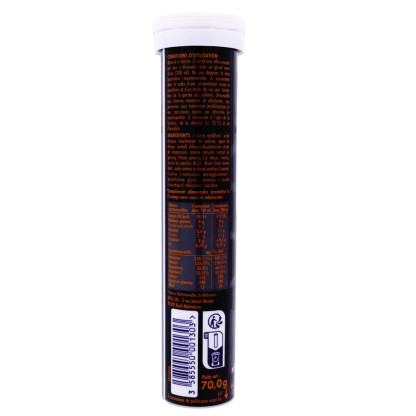 Sucre, acidifiant : acide citrique, bicarbonate de sodium, agent de charge : isomalt, chlorure de potassium, citrate de magnésium, arôme naturel, extrait de ginseng (Panax ginseng C.A Meyer, racine), extrait de paprika, BCAA : Brain Chain Amino Acids - acides aminés à chaîne ramifiée (L-leucine, L-valine, L-isoleucine), antiagglomérant : polyéthylène glycol, vitamine C (acide L-ascorbique), édulcorant : sucralose.