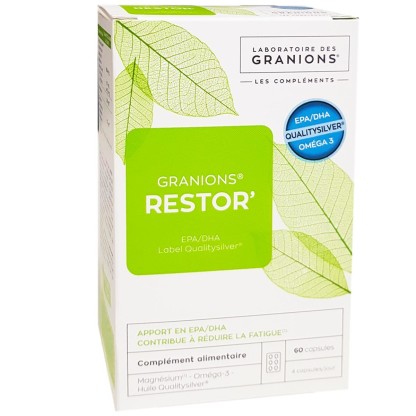 GRANIONS RESTOR' est un complément alimentaire conditionné sous forme de capsules à base d'oméga 3, de Magnésium qui contribue à réduire la fatigue et de Sélénimum qui aide à protéger les cellules contre le stress oxydatif. Les Oméga 3 contiennent des acides gras essentiels : l'EPA et le DHA. Le DHA participe au maintien d'une fonction cérébrale normale.