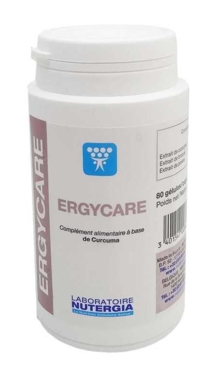 Le laboratoire Nutergia développe des compléments nutritionnels de haute qualité aux formules scientifiquement équilibrées et adaptées aux besoins de l’organisme, selon un concept totalement novateur : la nutrition active cellulaire. Il s’agit de rééquilibrer l’organisme en restaurant le bon fonctionnement des cellules par l’apport de micronutriments sélectionnés pour leur qualité et leur efficacité. Les produits Nutergia sont élaborés à partir d’huiles vierges première pression à froid, de plantes biologiques ou de culture sauvage et garantis sans OGM. ERGYCARE du Laboratoire NUTERGIA est un complément alimentaire conditionné sous forme de gélules, composé d’actifs judicieusement sélectionnés pour leur capacité à réduire les troubles digestifs ou hépatiques. La formule d’ERGYCARE associe le rhizome de curcuma traditionnellement utilisé pour ses bienfaits sur le système digestif et hépatique, le poivre et un extrait de brocoli (source de sulforaphane) qui participent au bon fonctionnement digestif et hépatique, et assurent le bon fonctionnement du système immunitaire.