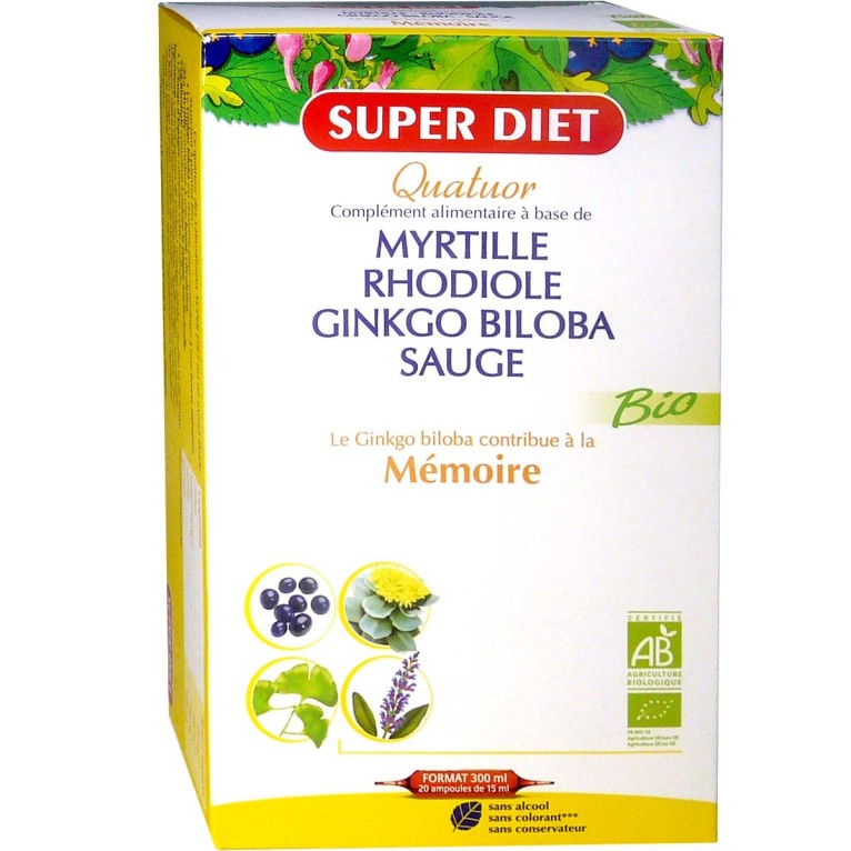 Quatuor Mémoire de SUPER DIET, est un complément alimentaire à base de ginkgo, qui aide à une bonne mémoire, et de myrtille, qui contribue à une bonne circulation sanguine. De la rhodiole et de la sauge d'Espagne, viennent s'ajouter à ce complément alimentaire.
