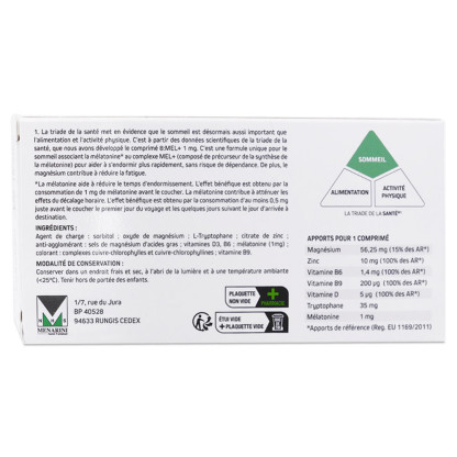 La mélatonine, ingrédient principal, contribue à réduire le temps d'endormissement* et les effets du décalage horaire**, un effet bénéfique obtenu avec une consommation de 1 mg peu avant le coucher. Le complexe MEL+ inclut des précurseurs de la synthèse de la mélatonine, soutenant ainsi la régulation du cycle veille-sommeil. Le magnésium, quant à lui, participe à la réduction de la fatigue. Cette synergie d'ingrédients assure un soutien optimal pour un repos nocturne de qualité.