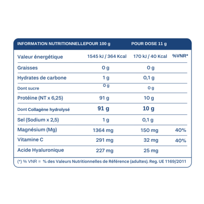 Complément alimentaire à base de : Protéine collagène hydrolysée COLPROPUS D® d'origine bovine, citrate de magnésium, vitamine C, acide hyaluronique, Stévia et arôme.