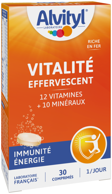 ALVITYL VITALITÉ comprimés effervescent des laboratoires URGO, un complexe multivitaminé avec des minéraux dont le fer et le magnésium pour contribuer à réduire la fatigue. Dès 12 ans.