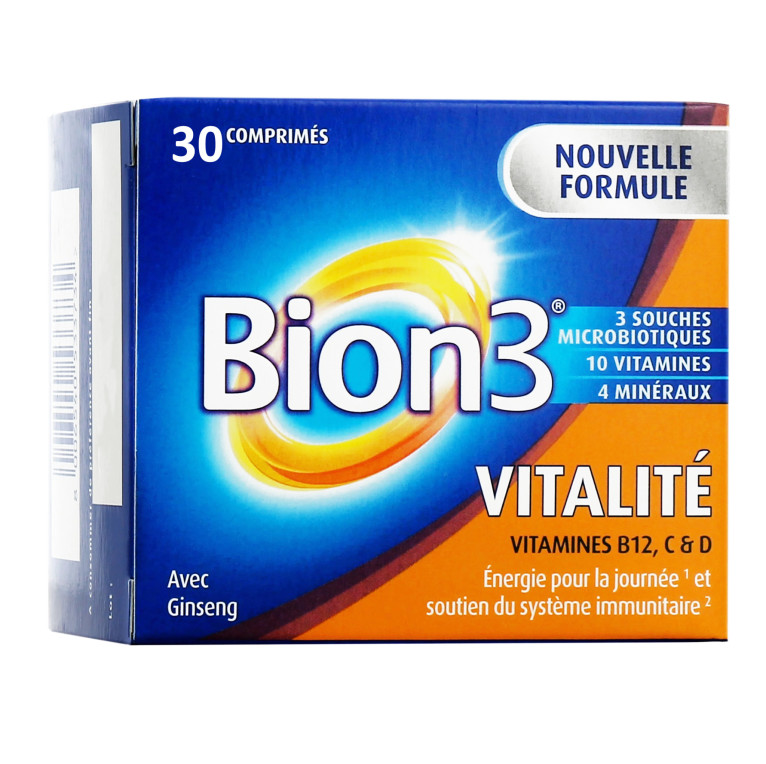 Le procédé de fabrication spécifique de BION3 Vitalité assure une libération progressive des actifs pendant 6 heures, pour réduire les effets « coup de pompe » notamment après la pause de midi ou en fin de journée. Bion®3 Vitalité est composé de 10 vitamines, y compris les vitamines C et D pour renforcer le système immunitaire, la vitamine B12 pour stimuler le métabolisme énergétique et réduire la fatigue, ainsi que 4 minéraux tels que le fer et le zinc pour soutenir la fonction cognitive normale. Il contient également du ginseng et 3 ferments lactiques brevetés.