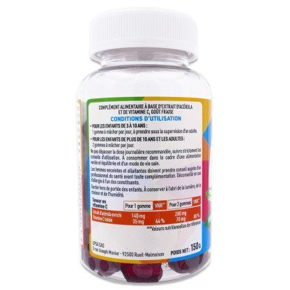 Pour 1 gomme : Extrait d'acérola enrichi - 140mg Vitamine C - 35mg (44% VNR*). Pour 2 gommes : Extrait d'acérola enrichi - 280mg Vitamine C - 70mg (88% VNR*). *VNR = Valeurs Nutritionnelles de Référence.