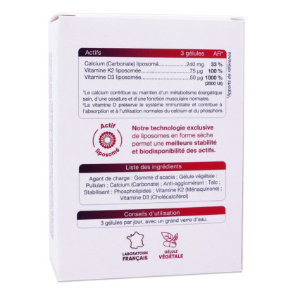 Agent de charge : Gomme d'acacia ● Gélule d'origine végétale : HPMC ● Calcium (Carbonate) ● Anti-agglomérant : Talc ● Stabilisant : Phospholipides ● Vitamine K2 (Ménaquinone) ● Vitamine D3 (Cholécalciférol)