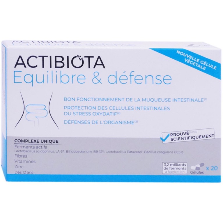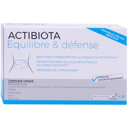 ACTIBIOTA Equilibre & Défense est un complément alimentaire conditionné sous forme de gélules, composé d’une association de ferments lactiques spécifiques, de vitamines B et de minéraux.La formule d’ACTIBIOTA Equilibre & Défense associe des souches de ferments lactiques (Lactobacillus acidophilus LA-5, Bifidobactérium BB-12, Lactobacillus paracasei, Bacillus coagulans BC513) ainsi que des vitamines B et du zinc qui participent au fonctionnement normale du système immunitaire. ACTIBIOTA peut être utilisé lors de prise d’antibiotiques.