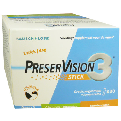 Issu du laboratoire Baush&Lomb, Preservision 3 contient une formule unique à base de zinc, de vitamines, d'oméga-3, de lutéine et de zéaxanthine : le zinc contribue au maintien d'une fonction visuelle normale, les vitamines C et E associées au zinc participent à la protection des cellules contre le stress oxydatif. Ce complément alimentaire contient également des Oméga-3 qui sont issus des microalgue source de DHA bénéfiques pour la vision. Les sticks orodispersibles au goût agrumes sont pratiques et agréables à prendre, idéaux pour une utilisation quotidienne.