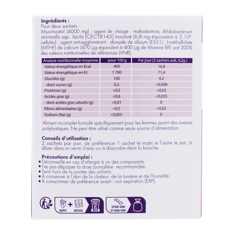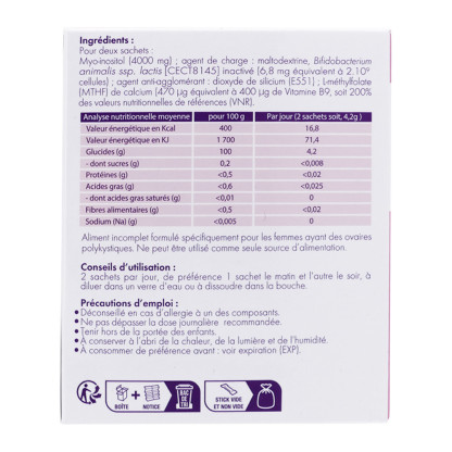 Ingrédients pour 2 sachets : Myo-inositol (4000 mg) ; agent de charge : maltodextrine ; Bifidobacterium animalis ssp. lactis (CECT8145) inactivé (6,8 mg équivalent à 2.109 cellules) ; agent anti-agglomérant : dioxyde de silicium (E551) ; L-méthylfolate (MTHF) de calcium (470 µg équivalent à 400 µg de vitamine B9, soit 200 % des valeurs nutritionnelles de référence [VNR])