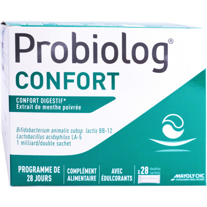 Probiolog® CONFORT des laboratoires Mayoly Spindler est un complément alimentaire conditionné sous forme de double-sachet, composé de souches microbiotiques. Ces ferments lactiques sont des micro-organismes vivants déjà présents dans l'organisme qui peuvent être en nombre insuffisant lors de prises médicamenteuses par exemple (antibiotiques) ou bien lors de petits maux hivernaux. Probiolog® CONFORT contient également un extrait de menthe poivrée qui aide à soutenir une digestion saine.