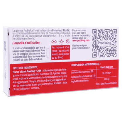 Composition nutritionnelle pour 1 stick de Probiolog® FLASH par jour :Lactobacillus rhamnosus GG et Lactobacillus plantarum Lp-115 : 30.109 UFC*Argile Montmorillonite : 100 mg. *UFC: Unité Formant Colonie