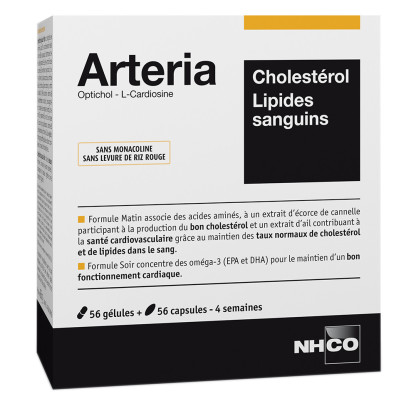 ARTERIA Nutrition, est un complément alimentaire innovant qui se compose de 2 formules, une formule Matin et une formule Soir pour une action complète. La formule du matin associe le complexe Optichol™ au complexe L-Cardiosine™. L’Optichol, se compose d’extrait breveté d’olivier, d’extrait d’écorce de cannelle et d’extrait d’ail , ce dernier aide à maintenir des taux de lipides sanguins normaux et contribue à la santé vasculaire. L'action de la choline contribue au métabolisme normal des lipides également. Ce complément alimentaire contient également un complexe de L-Cardiosine™ composé de L-Arginine, L-Lysine et vitamines B5, B6, C La formule Soir est ultra-riche en Oméga-3 DHA et EPA qui contribuent au fonctionnement normal du cœur.