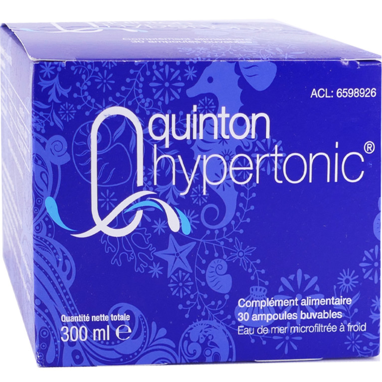 QUINTON HYPERTONIC BUVABLE est un complément alimentaire conditionné en ampoule contenant de l’eau de mer océanique composée de minéraux et d'oligo-éléments dont du magnésium. Dans cette formule le magnésium participe à réduire la fatigue, au fonctionnement normal du système nerveux et de la fonction cognitive ainsi qu' à une fonction musculaire normale. Enfin il contribue également à un métabolisme énergétique normal.