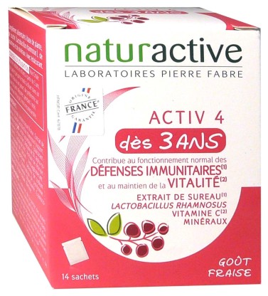 NATURACTIVE du laboratoire Pierre Fabre est composé de produits et compléments alimentaire de phytothérapie et aromathérapie à base d’ingrédients naturels pour le bien être de l’organisme et la santé de la peau, des cheveux et des ongles. Activ 4 Dès 3 ans de NATURACTIVE composé d’extrait de plante, vitamines, minéraux, oligo-éléments et d’une souche le lactobacille (lactobacillus rhamnosus), va participer au bon fonctionnement du système immunitaire et permettre de redonner de la vitalité. Les vitamines A, B, C et D, le fer, le zinc, le sélénium, et le sureau riche en polyphénols, vont diminuer la fatigue, renforcer les défenses immunitaires, et maintenir le tonus. Ces sachets au bon goût de fraise raviront les plus petits. Le complément alimentaire Activ 4 peut être pris par les adultes. Rapidement, l’organisme retrouve de la vitalité.