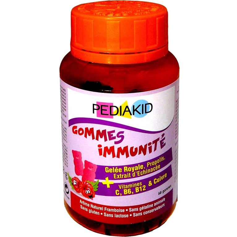 Gommes Immunités PEDIAKID est un complément alimentaire sous forme de gommes à mâcher, composé de vitamines et minéraux, ainsi que d’extraits de plante, propolis et gelée royale. L'échinacée, et la vitamine C contribue au fonctionnement normal du système immunitaire. Les vitamines B6, B12, et le cuivre viennent compléter la formule de PDIAKID Gommes IMMUNITÉ. Le goût fruité à l’arôme naturel de framboise de ces gommes en forme d'oursons ravira les enfants !
