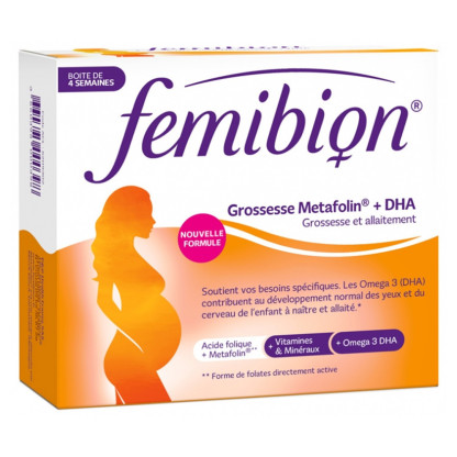 FEMIBION Grossesse Metafolin + DHA Grossesse et allaitement de P&G HEALTH FRANCE, le complément alimentaire pour les femmes enceintes et allaitantes à base de nutriments et notamment de folates (Vitamine B9) qui contribuent à la croissance des tissus maternels durant la grossesse.
