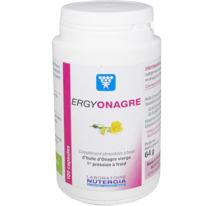 Le laboratoire Nutergia développe des compléments nutritionnels de haute qualité aux formules scientifiquement équilibrées et adaptées aux besoins de l’organisme, selon un concept totalement novateur : la nutrition active cellulaire. Il s’agit de rééquilibrer l’organisme en restaurant le bon fonctionnement des cellules par l’apport de micronutriments sélectionnés pour leur qualité et leur efficacité. Les produits Nutergia sont élaborés à partir d’huiles vierges première pression à froid, de plantes biologiques ou de culture sauvage et garantis sans OGM. ERGYONAGRE est un complément alimentaire composé d’huile d’onagre vierge qui est une plante d’origine Nord-Américaine riche en acides gras essentiels (acide linolëique, acide gamma-Linolénïque) fabriquée par première pression à froid, pour diminuer les symptômes liés au cycle féminin ou pré ménopause/ménopause (troubles de l’humeur, douleurs de ventre ou de tête, imperfections cutanées,…), et redonner de la jeunesse et de la beauté à la peau en la préservant du vieillissement cutané pour lui redonner souplesse et élasticité. Pour une action efficace d’ERGYONAGRE, la consommation bénéfique de l’huile d’onagre est de 6000mg.