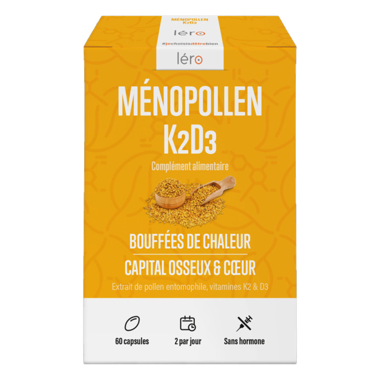 Découvrez les compléments alimentaires LERO MENOPOLLEN K2K3, issus du laboratoire LERO, spécialisé dans les produits de santé naturels. Ce complément alimentaire est spécialement conçu pour la période de ménopause. La ménopause est la période de la vie d'une femme marquée par l'arrêt de l'ovulation et la disparition des règles. Les femmes subissent des bouffées de chaleur, de la fatigue, de l'irritabilité, des troubles du sommeil... durant cette période. Ces capsules contiennent des vitamines K2 et D3 ainsi que des extraits de pollen entomophile. Les extraits de pollen aident à diminuer les bouffées de chaleur.