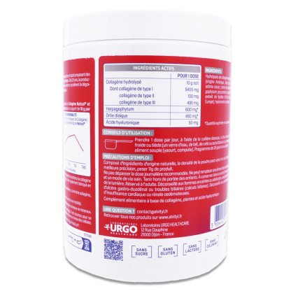 Complément alimentaire à base de collagène marin et extraits de plantes. Hydrolysats de collagène marin (poissons) (origine Amérique, Asie et/ou Europe) ; arôme cacao ; extrait de racines d'Harpagophytum procumbens (origine Afrique) ; extrait de feuilles d'Urtica dioica (origine Europe) ; hyaluronate de sodium.