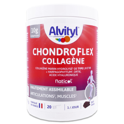 Le complément alimentaire Chondroflex est développé par le laboratoire Alvityl, reconnu pour sa gamme de produits de qualité. Il contient un hydrolysat de collagène marin de type I, II et III issu de poisson, apportant 10g de collagène par jour, qui soutient la structure des tissus conjonctifs. L'harpagophytum est inclus pour participer à la mobilité articulaire et au maintien de la souplesse des articulations. L'ortie est reconnue pour son rôle dans le maintien de la souplesse des articulations, des muscles et des tendons. L'acide hyaluronique, naturellement présent dans le corps, est connu pour préserver l'hydratation des cellules. Le tout est agrémenté d'un arôme naturel de chocolat pour une consommation agréable.