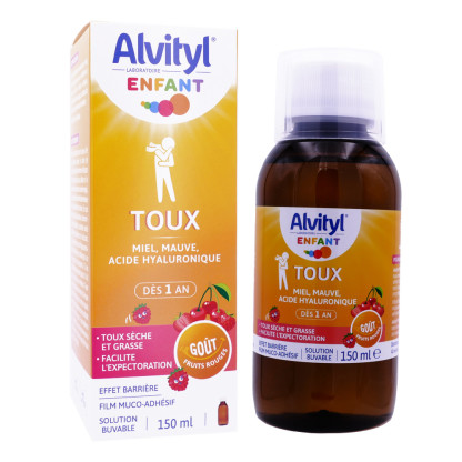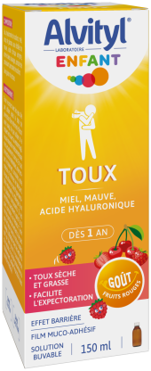 Alvityl® Enfant Toux est un complément alimentaire sous forme de solution buvable à base d’acide hyaluronique et de miel qui crée un film mucoadhésif protecteur agissant comme une barrière pour apaiser la toux, qu'elle soit sèche ou grasse, en protégeant les voies respiratoires supérieures. Sa formulation est spécialement conçue pour adhérer à la muqueuse et réduire l'exposition aux irritants externes. De plus, Alvityl® Enfant Toux favorise l'hydratation de la muqueuse et du mucus, facilitant ainsi leur élimination.