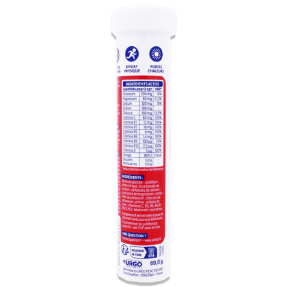 Dextrose glucose ; acidifiant : acide citrique ; bicarbonate de sodium ; carbonate de calcium ; carbonate de magnésium ; carbonate de potassium ; chlorure de potassium ; arôme ; amidon de maïs ; vitamines C, B3, B5, B6, B1, B9, D, B12 ; édulcorant : sucralose.