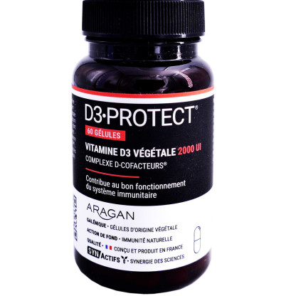 D3 PROTECT des laboratoires ARAGAN est un complément alimentaire conditionné sous forme de gélules végétales et formulé à partir de vitamine D3 d'origine végétale et d'un complexe D-Cofacteurs.