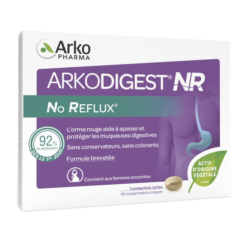ARKODIGEST No Reflux est un complément alimentaire sans conservateurs ni édulcorant sous forme de comprimés à croquer, à base d’une formule d’origine végétale et minérale. A base d’orme rouge, chaque comprimé contient 200 mg de poudre de son écorce.La formule innovante d’ARKODIGEST No Reflux 100% d'origine végétale et minérale a fait l'objet d'un brevet français n°1759155.Utilisable chez les femmes enceintes.