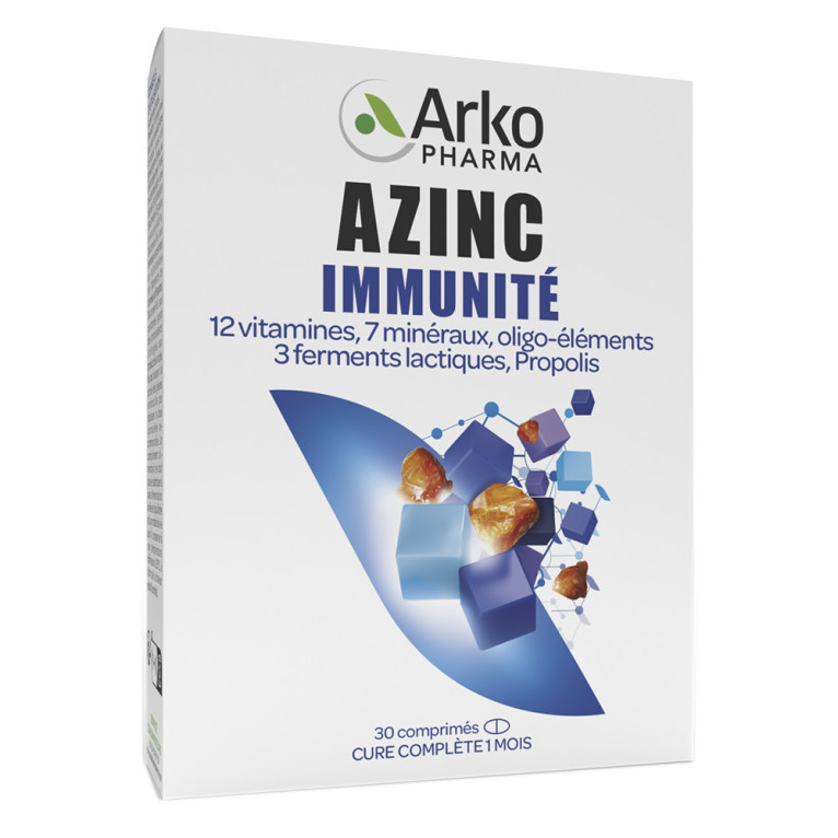 Azinc Immunité d’ARKOPHARMA est un complément alimentaire sous forme de comprimés tri-couches qui est riche en vitamines, minéraux et oligo-éléments. Il contribue à réduire la fatigue grâce à l'action de la vitamine C , celle-ci ainsi que la vitamine D contribuent au fonctionnement normal du système immunitaire. Azinc Immunité contient également 3 ferments lactiques et de la propolis.