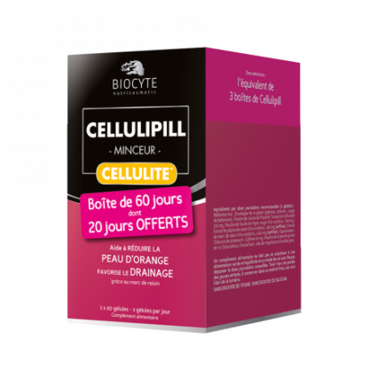 CELLULIPILL MINCEUR CELLULITE de BIOCYTE Nutricosmetic, le complément alimentaire sous forme de gélules à base de Marc de Raisin qui aide à réduire la peau d'orange et à favoriser le Drainage, dans votre parapharmacie en ligne à prix discount.