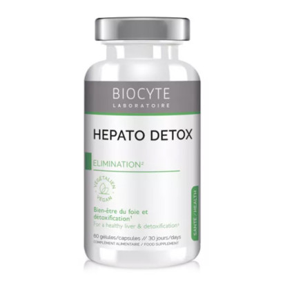 BIOCYTE HEPATO DETOX, un complément alimentaire triple action qui convient aux végétariens et aux végétaliens à base d'extrait d'Artichaut qui participe à la détoxification, aide à soutenir les flux des sucs digestifs et contribue au bon fonctionnement du foie, de la poudre de Fenouil favorisant les fonctions d'élimination rénale ainsi que de la choline qui contribue au maintien d'une fonction hépatique normale.