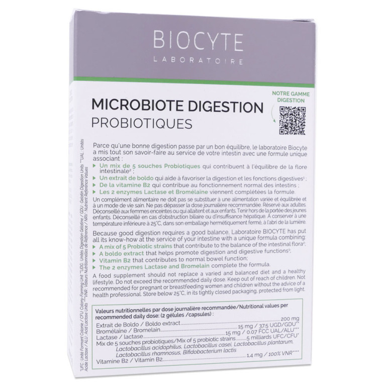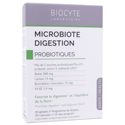 BIOCYTE MICROBIOTE DIGESTION PROBIOTIQUES 30 GÉLULES est disponible en vente en ligne à prix discount sur Pharmashopdiscount.