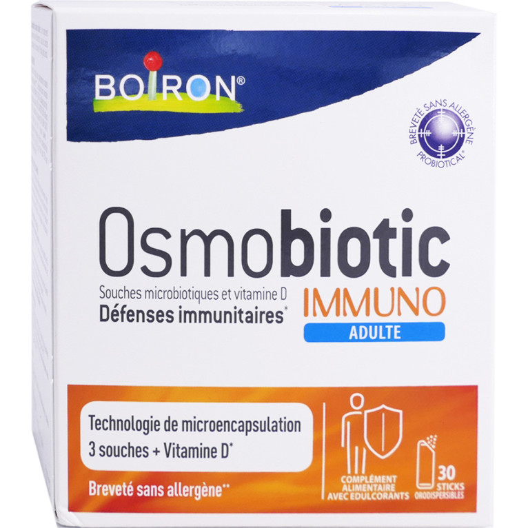 OSMOBIOTIC IMMUNO Adulte discount du laboratoire BOIRON, un complément alimentaire sous forme de sticks orodispersibles avec édulcorants, à base de souches microbiotiques encapsulées et vitamine D dans votre parapharmacie en ligne à prix discount. Pour Adultes.