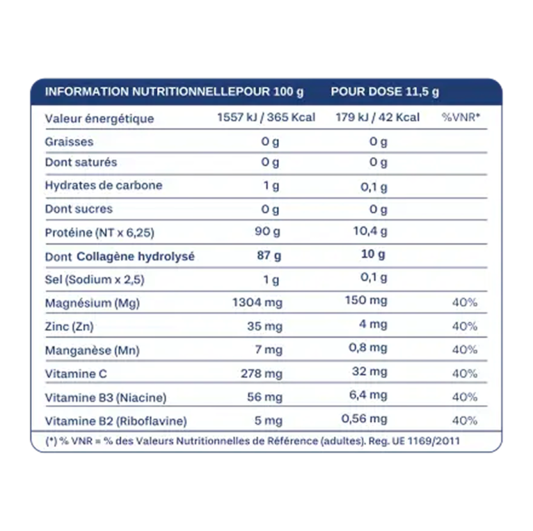 Pour 100g : Valeur énergétique 1557kJ/365 kcal, Graisses 0g dont saturés 0g, Protéine 90g dont Collagène hydrolysé 87g, Hydrates de carbone 1g dont sucres 0g, Sel 1g, Magnésium 1.304 mg, Zinc 35 mg, Manganèse 7 mg, Vitamine C 278mg, Vitamine B3 56mg, Vitamine B2 5 mg,