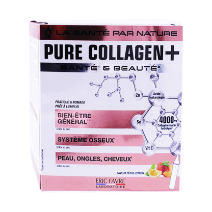 Pure Collagen+ des laboratoires ERIC FAVRE est un complément alimentaire en shots. Sa composition associe du collagène marin, de l'acide hyaluronique, du zinc de la vitamine E et du Sélénium. Le collagène est une protéine naturellement présente dans les tissus conjonctifs (peau, tissus osseux, ligments,…). Le collagène marin de la formule, sous forme hydrolysé permet une meilleure assimilation par l’organisme Dans cette formule le zinc participe au maintien d'une ossature normale mais également au maintien d'une peau, de cheveux et d'ongles normaux.
