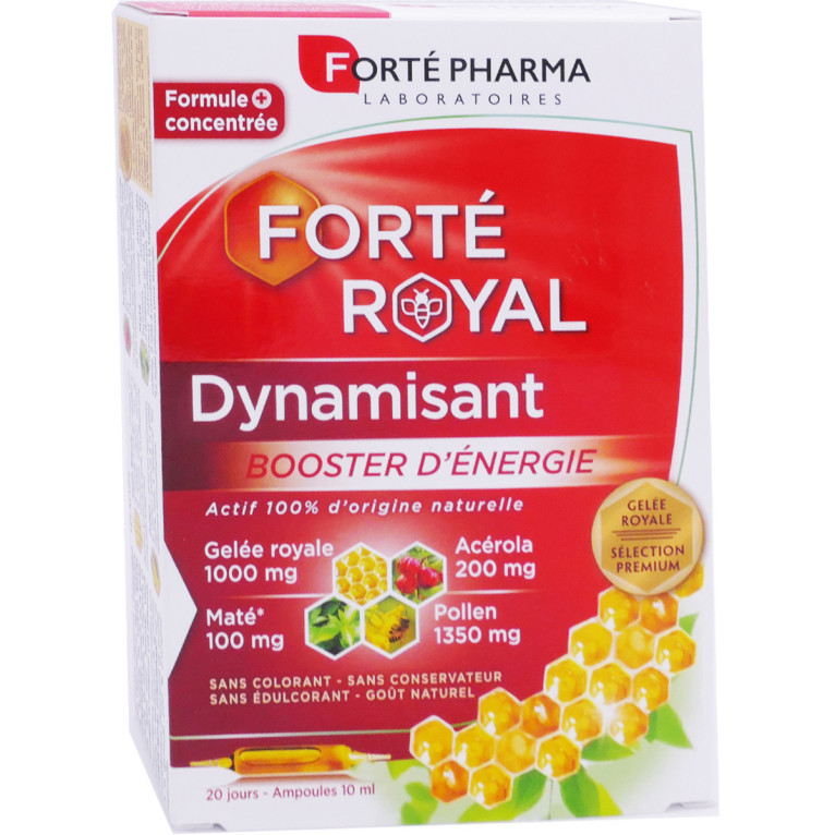 Depuis 1999, les Laboratoires FORTÉ PHARMA développent des compléments alimentaires efficaces et innovants, aux formules issues de la recherche en nutrition cellulaire, pour contribuer aux ressources des utilisateurs. L’univers énergie de FORTÉ PHARMA propose des produits conçus pour contribuer à conserver tonus, vitalité, et forme physique et intellectuelle. FORTE ROYAL Dynamisant Booster d’Energie de FORTÉ PHARMA est un complément alimentaire conditionné sous forme d’ampoules, spécialement formulé à base d’acérola, ou cerise du Brésil, un petit fruit à la haute teneur en vitamine C, du pollen, principal aliment des abeilles butineuses, du maté riche en caféine, et de la gelée royale. Produite par les abeilles pour nourrir leur reine, elle est très riche en minéraux et oligo-éléments, et contient également un acide gras spécifique introuvable dans d’autres aliments : l’acide hydroxydécanoïque. La vitamine C contribue à réduire la fatigue et le maté participe à la résistance contre la fatigue mentale et physique Sans colorant, sans édulcorant ni conservateur.