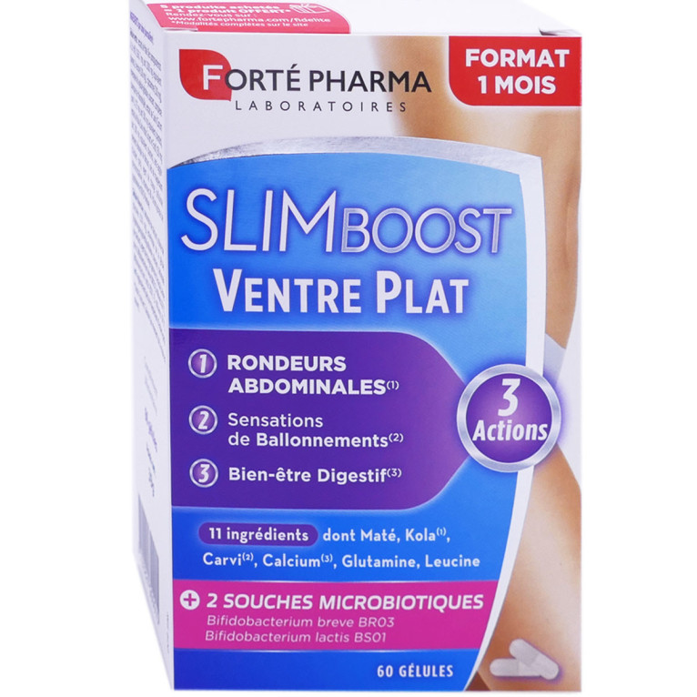 Depuis 1999, les Laboratoires FORTÉ PHARMA développent des compléments alimentaires efficaces et innovants, aux formules issues de la recherche en nutrition cellulaire, pour contribuer aux ressources des utilisateurs.L’univers Minceur de FORTÉ PHARMA propose des produits conçus pour favoriser la perte de poids en complément d’une alimentation adaptée et d’une activité sportive avec 4 gammes de produits et compléments alimentaires dédiés: Perdre du poids, Drainer et détoxifier, Gérer son poids et Minceur ciblée. Slim Boost ventre plat de FORTÉ PHARMA est un complément alimentaire conditionné sous forme de gélules, spécialement formulé avec du Kola pour aider à brûler les graisses et du Carvi pour soulager les troubles digestifs comme les ballonnements. La formule innovante de Slim Boost ventre plat associe un extrait de carvi et 2 souches microbiotiques. Le carvi est associé à la glutamine, la leucine, le kola et le maté qui aide à maintenir un poids corporel sain.