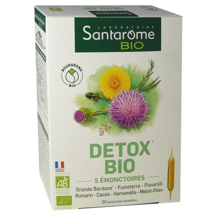 Le laboratoire Santarome français conçoit des compléments alimentaires de phytothérapie exclusivement à base de plantes bio pour répondre au bien-être de tous au quotidien (sommeil, détoxification,…). DETOX bio, conditionné en ampoule, est un complément alimentaire destiné à purifier l’organisme et stimuler les fonctions d’élimination. L’association de la bardane, du romarin, du cassis, de la furneterre, et du pissenlit, associés à des macérât de bourgeons (frêne, églantier) riches en acides aminés, enzymes, vitamines, minéraux et oligo-éléments, facilite les fonctions d’éliminations de l’organisme par les reins, participe au bon fonctionnement du système immunitaire, et agit sur la bonne santé du système hépatique.