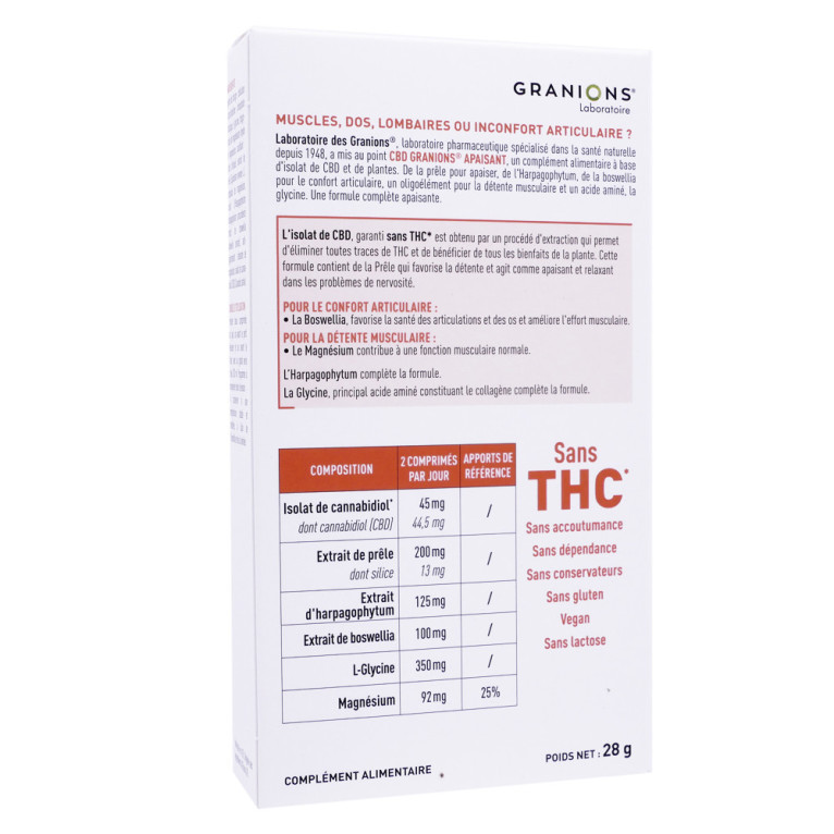 Composition Pour 2 comprimés : Isolat de cannabidiol 45 mg dont cannabidiol 44,5 mg ; Extrait de prêle 200 mg dont silice 13 mg ; Extrait d'harpagophytum 125 mg ; Extrait de boswellia 100 mg ; L-Glycine 350 mg ; Magnésium 92 mg 25 % AR*. * AR : Apports de Référence
