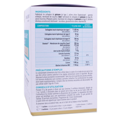 Ingrédients : Hydrolysat de collagène de POISSON type I, membrane de coquille d’OEUF, hydrolysat de collagène de POISSON type III, antiagglomérant : phosphate tricalcique, poudre de jus d’acérola (Malpighia glabra L), antiagglomérant : cellulose microcristalline, lubrifiant : sels de magnésium d’acides gras, hydrolysat de collagène de POISSON de type II, gluconate de cuivre, biotine.