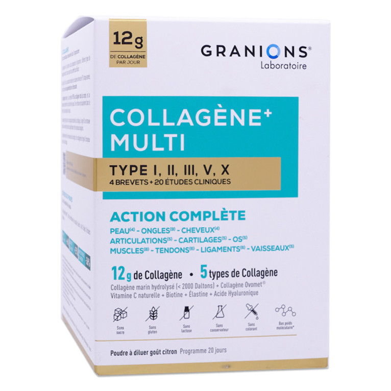 Le complément alimentaire GRANIONS COLLAGENE MULTI est une formule complète qui soutient la fonction des articulations et de la peau grâce à une combinaison unique d’ingrédients actifs. Il contient notamment un complexe OVOMET, qui regroupe cinq types de collagène, de l'acide hyaluronique, de l'élastine, ainsi que des vitamines d'origine naturelle telles que la biotine et la vitamine C. Le collagène (issu de membrane de coquilles d'œuf) contribue au maintien de la structure des tissus conjonctifs et soutient la fonction normale de la peau. La vitamine C, quant à elle, aide au fonctionnement normal du collagène pour le fonctionnement normal des vaisseaux sanguins, de la peau, des os et des cartilages mais également participe à la protection des cellules contre le stress oxydatif et à la réduction de la fatigue. Le cuivre, également présent, participe à la protection des cellules contre le stress oxydatif, au maintien des tissus conjonctifs normaux ainsi qu'à la pigmentation normale des cheveux et de la peau. Formulé par le laboratoire Granions, ce complément alimentaire est spécialement conçu pour les personnes soucieuses de préserver la beauté de leur peau et leurs articulations.