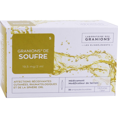 GRANIONS de Soufre discount, un médicament conditionné en ampoules utilisé comme modificateur du terrain en particulier au cours d'affections récidivantes cutanées, rhumatologiques et de la sphère O.R.L. ATTENTION CECI EST UN MÉDICAMENT non soumis à prescription médicale.