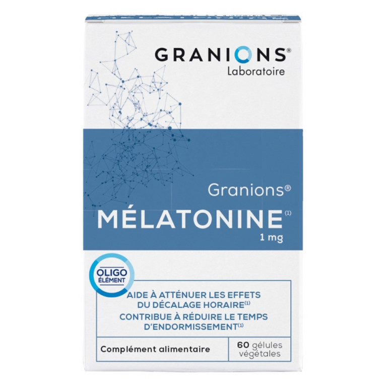 GRANIONS Décalage Horaire est un complément alimentaire sous forme de gélules végétales composé de mélatonine (hormone naturelle du sommeil ) et de magnésium qui est un oligo-élément essentiel.Le magnésium contribue à réduire la fatigue et au fonctionnement normal du système nerveux et cognitif.De plus, la mélatonine à un dosage de 1mg favorise un sommeil normal, participe à s'endormir de façon naturelle.Elle contribue à la réduction des effets du décalage horaire dès 0.5mg.
